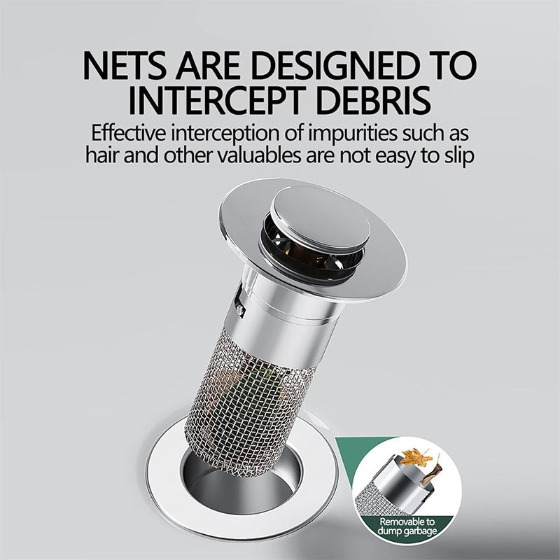 • 【Bathroom Sink Drain Strainer Hair Catcher】This bathroom sink stopper is designed to catch hair and prevent clogging in bathroom sinks. It features a pop-up mechanism for easy opening and closing of the drain, and a removable stainless steel filter basket for convenient cleaning.