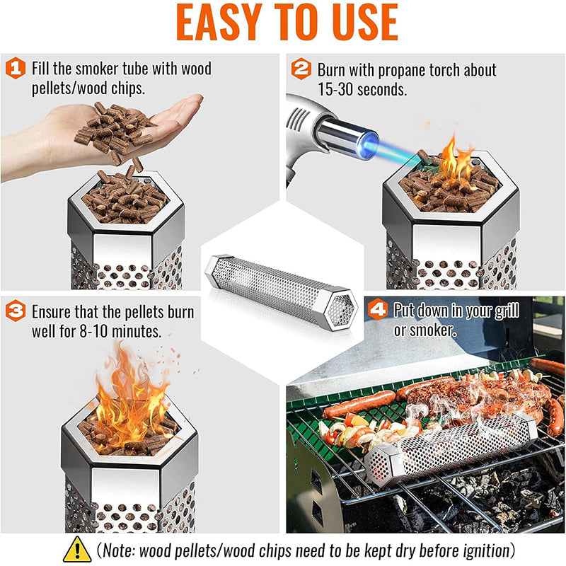 - ❤️【IMPROVED DESIGN AND 304 STAINLESS STEEL MATERIAL】 Our premium stainless steel tube smoker with new hexagon design, it will not roll up or fall off on the grill to provide you a better smoke absorption effect. What's more, this 12" smoker tube is made of 100% high quality 304 stainless steel material, not broken or bent easily after repeated use. Keep you and your family healthy.