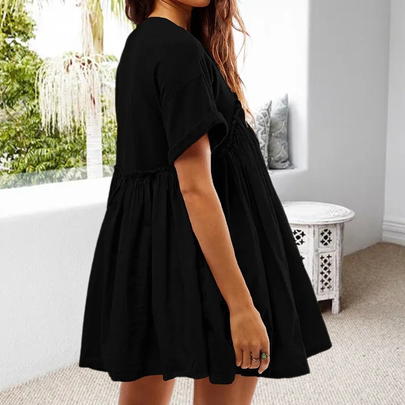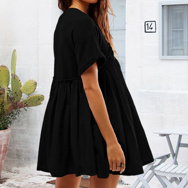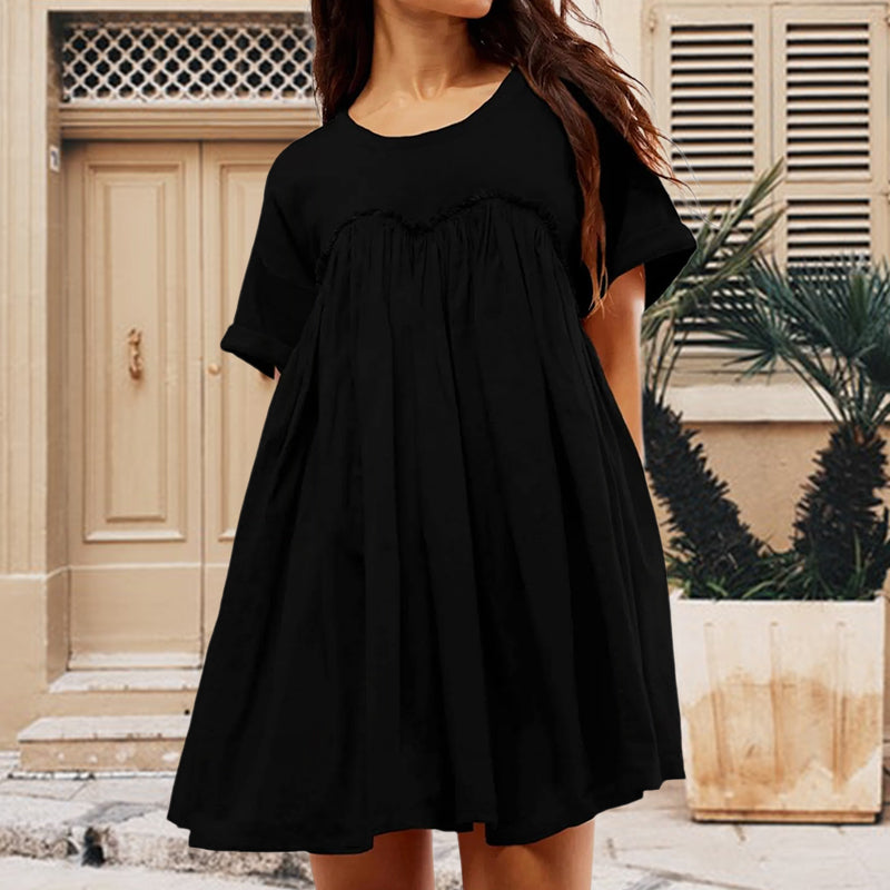 Design: Womens casual summer short dresses features loose fit style, short sleeve with roll detail, round neckline, patchwork pleated line dress bottom, layered a line cutting, solid color.